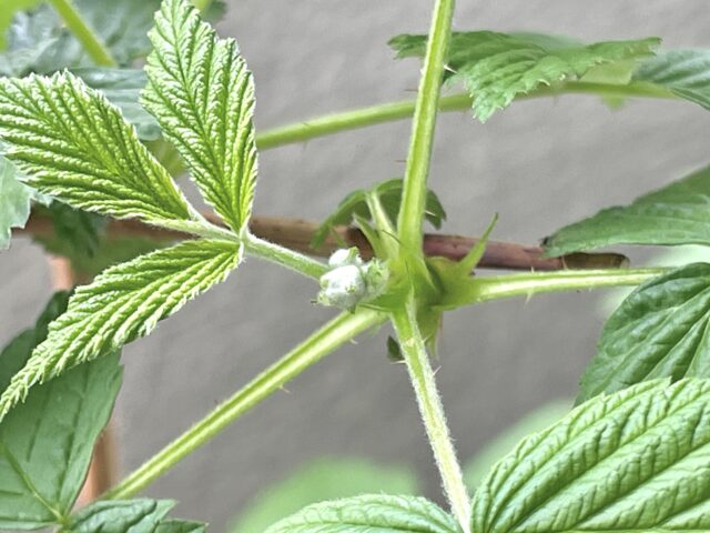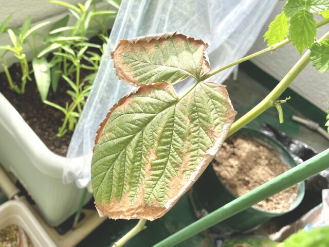 根は弱って水分供給がうまくいかない状態で、地上部は灼熱の酷暑、というのが大変よろしくないので、遮光したり、場合によってはクーラーの効いた涼しい室内にラズベリーの鉢を取り込んで養生がもしれません。